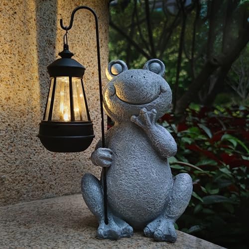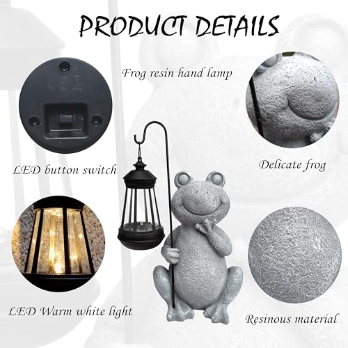 ?????Unique design?The smiling frog, holding a lantern in his right hand and resting his chin in his left,is delightfully naive. Applicable for various scenarios.The size of this frog figurine is 8.9X5.9X4.3inchhes,the lantern is 5.5X2.75X2.75inches.The frog figurines made of resin material, hand-painted and finished with a UV resistant coating can withstand rain, snow or scorching sun without fading.