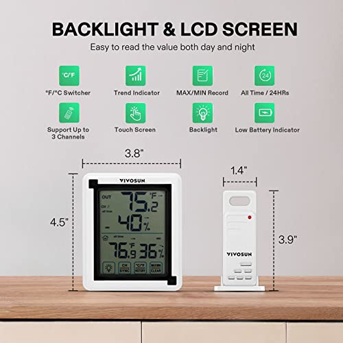 Precise Data: Vivosun wireless indoor outdoor thermometer records accurate all time/24 hours max and min temperature and humidity readings; Temperature trend arrows indicate whether it’s getting warmer or colder near the remote temperature monitor; Temp Accuracy: ± 1.5°F/± 1°C; Humidity Accuracy: ±5%