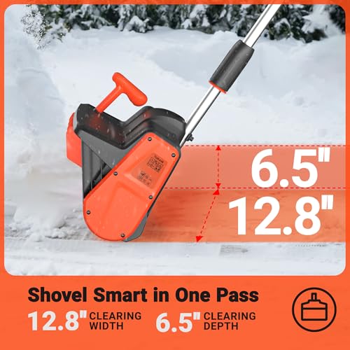 Versatile Snow Clearing: With a clearing width of 12.8 inches and a depth of 6.5 inches, this snow shovel cordless is ideal for various surfaces such as driveways, patios, decks, sidewalks, and walkways. The battery snow shovel operating quietly, perfect for residential areas where noise levels need to be minimized, ensuring that you won't disturb your neighbors during snow removal.