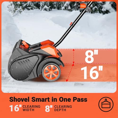 QUITE AND VERSATILE PERFORMANCE - Clear paths up to 15.7 inches wide and 8 inches deep without disturbing the peace with our battery operated snow shovel. The battery powered snow shovel perfect for driveways, patios, decks, and sidewalks, and it’s the ideal choice for quiet, efficient snow removal at home.