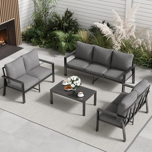 All-Weather Patio Furniture Set with Cushions: the all-aluminum frame is designed to withstand all types of weather, making it ideal for year-round outdoor use. The seat cushion and backrest are designed to be removable and washable, making cleaning easier.