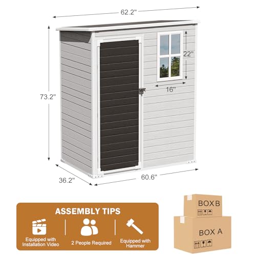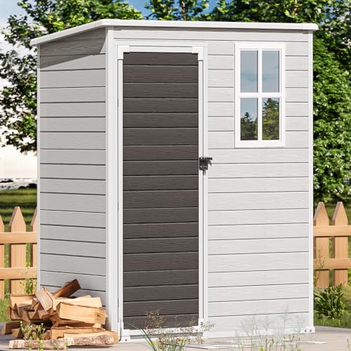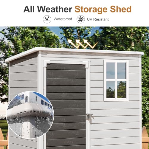 ????PREMIUM RESIN MATERIALS:Our durable storage shed is crafted with 15MM premium polypropylene resin plastic, which is thicker than others in the market. Resin shed is waterproof, rustproof and UV-resistant, less bending and puncturing, worry-free for use in all weather conditions. It is a great shed house for your backyard, patio and garden.