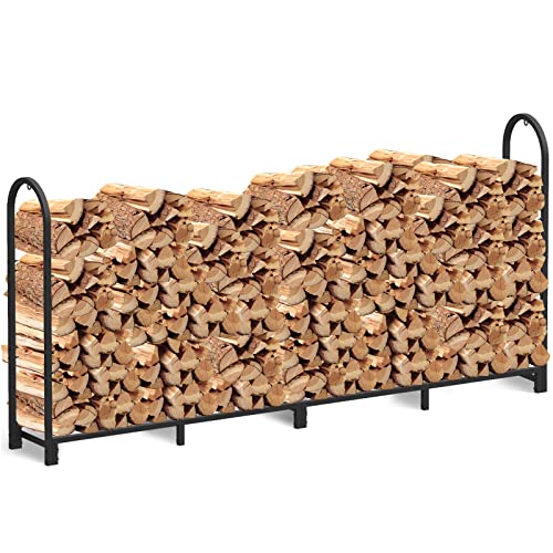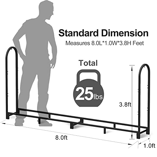 Firewood Organized: The 8FT fireplace log rack measures 94.1L x12.9W x 45.7H inches and can easily withstand a load of up to 220lbs. Perfect size firewood storage rack to fit on the outdoor back porch, back yard deck, outside backyard fire pits, under eaves, tool shed, wood shed, chaotic pile inside the cabin, indoor garage, family room, covered patio to hold enough wood for fireplace all seasons. Perfect size to fit outdoor porch, backyard deck, backyard fire pits, shed, garage, covered patio.