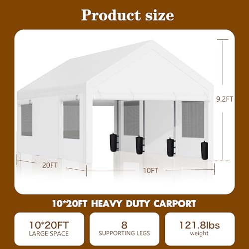 ?Large Portable Garage?The 10x20 ft carport canopy heavy-duty provides ample space for your vehicles, boats, cargo, etc. Removable sidewalls and doors can meet your various needs. The carport canopy shelter is perfect for parties, commercial exhibitions, outdoor events, weddings, storage shelters, and so on.