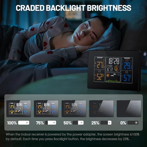 Multifunctional weather forecaster with color display: The color display can clearly read indoor and outdoor temperature and humidity information, weather forecast, atmospheric pressure index, moon phase, date, and provide comfort indication, temperature alarm, etc