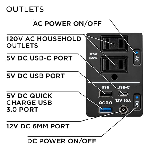 VERSATILE OUTLETS CHARGE UP TO 6 DEVICES AT THE SAME TIME: Pushing 150 Rated and 300 Peak Watts Through (2) 120V Household Outlets, (1) USB Port, (1) Quick Charge USB Port, (1) USB-C Port, (1) 6mm 9-12V DC Outlet, (1) 12V Cigerette Lighter Outlet - Strong Enough To Easily Power 50? LED TV, Humidifer, or Refrigerator