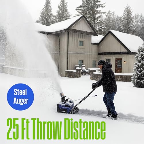 EASY & EFFECTIVE: Low-maintenance battery powered motor, cord-free and easily maneuverable, yet powerful enough to throw snow 25 feet; dual LED lights for winter nights; 180 degree adjustable snow thrower chute