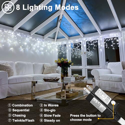 ?Upgraded 8 Modes LED Christmas Lights? The icicle Lights have 8 selections of light pattern: 1.Combination 2.In Waves 3.Sequential 4.Slo-Glo 5.Chasing/Flash 6.Slow Fade 7.Twinkle/Flash 8.Steady On. Different lighting effects are controlled by the button on the plug. These beautiful and vibrant outdoor icicle lights will bring you a lot of festive atmosphere.