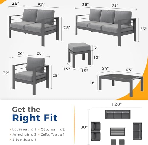 SECTIONAL FLEXIBILITY- Including a high bar table, a single-, a double-, a three corner sofa, and 2 ottomans, this metal outdoor patio furniture set’s sectional design enables flexibility for versatile configurations to fit your specific needs. The aluminum furniture will blend seamlessly into any arrangement, making this the perfect conversation spot on your patio.