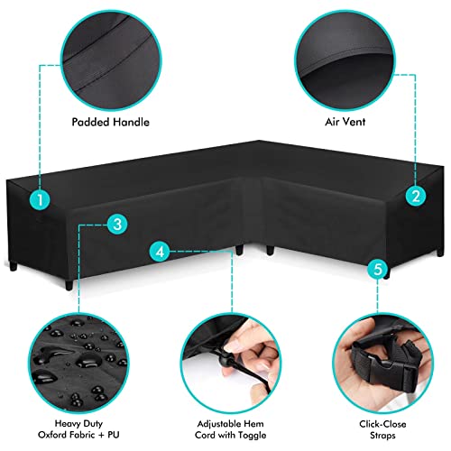 WINDPROOHANDLES AND AIR VENT: Durable padded handles make it easier to install and remove. Air vent can reduce condensation and provide maximum ventilation.F PATIO SECTIONAL COVER: 6 Solid click-close straps and Snug-fitting drawstring at them with adjustable toggle fit with exceptional security in the windiest conditions.