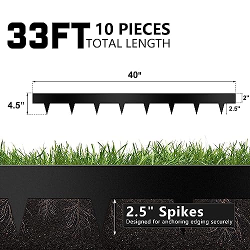 ABOUT THE EDGING: 2" above ground, spikes are 2.5” in height; 10 Pack of 40" each, 33Ft in total installed; 11 pieces 7'' clamps offer extra stability; Clips and gloves included; These long strips of metal edging are flexible enough to bend to your exact specifications