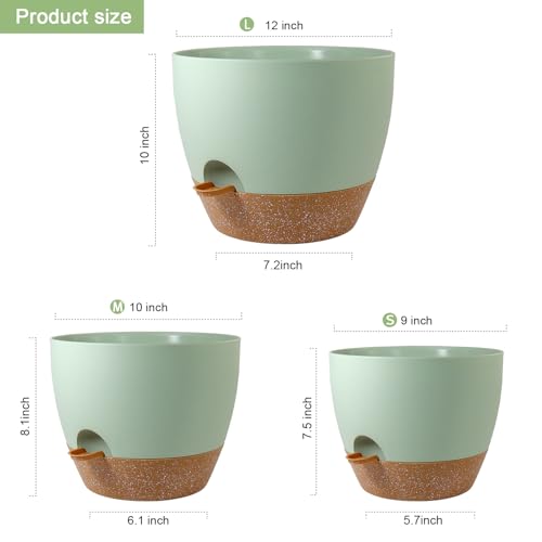 Self watering flower pots watered by a cotton rope that draws water from a reservoir at the bottom. Set of 3 plastic planters with mesh drainage holes and deep reservoir for indoor outdoor garden plants and flowers.