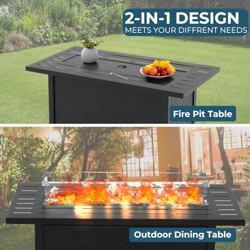 MULTI-FUNCTION: The 45" large gas fire pit allow you to put more drinks and snacks on the table top. When it is not in use, just cover the burner with lid and easily convert it into a dining table, coffee table, or bar table, perfect for your porch and backyard.
