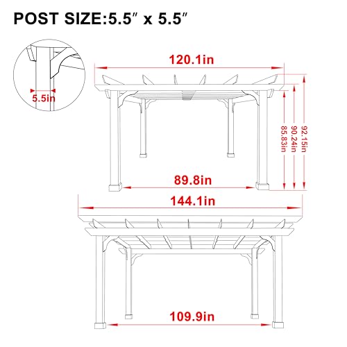 [Dimensions] Overall size: 144.1" L x 120.1" W x 88.2" H. Interior size: 109.9" L x 89.8" W x 81.9" H. Maximum entrance height: 81.9 inches. Post size: 5.5" x 5.5".