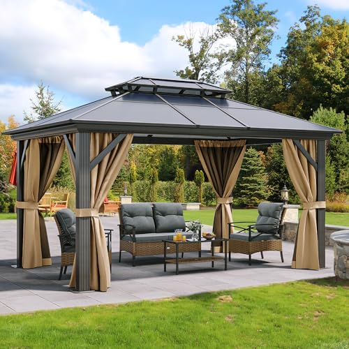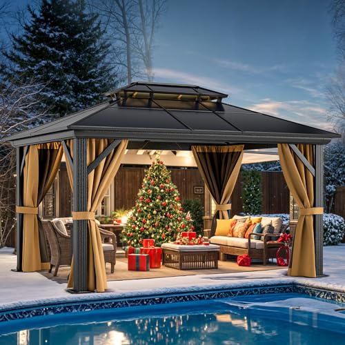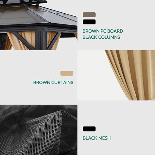 DOUBLE POLYCARBONATE ROOF- This 6mm thick all season gazebo protects against bad weather during outdoor activities; The heat insulation layer blocks 99% of harmful UV rays and reduces heat; Sleek roof slope design also prevents rain from gathering