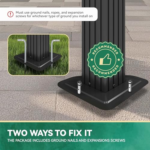 Tips: While grass installation is possible with included stakes when properly anchored, we strongly recommend a solid surface like a patio or deck for greater stability, wind resistance, and reduced long-term maintenance.