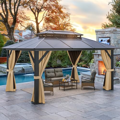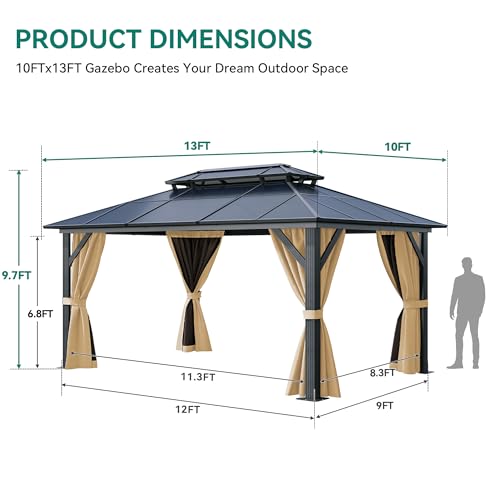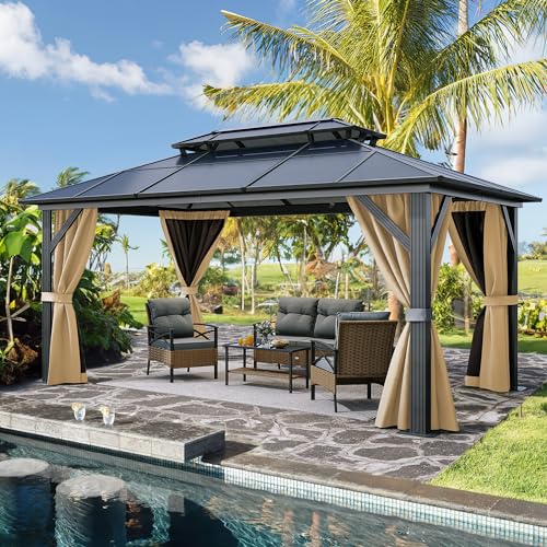 DOUBLE POLYCARBONATE ROOF- This 6mm thick all season gazebo protects against bad weather during outdoor activities; The heat insulation layer blocks 99% of harmful UV rays and reduces heat; Sleek roof slope design also prevents rain from gathering