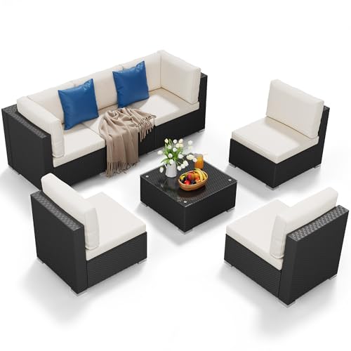 Cushioned Comfort: Enjoy the plush comfort of thick, sponge-filled seat and back cushions that offer excellent resilience; The horn buckles keep the cushions securely in place, while the neutral beige cushions complement the sleek black rattan for a modern aesthetic