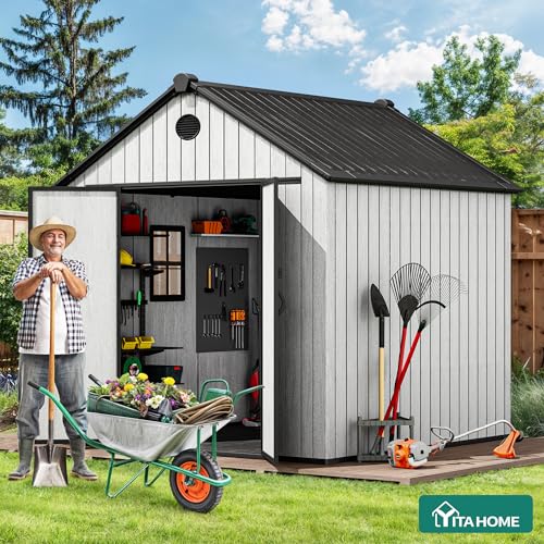 Sturdy Build: Crafted from solid PP material, this shed with window withstands fading, corrosion, and UV light for weather resistance; Its 16mm thick panels ensure solid structure with lasting durability; External measures 7.84 x 6.78 x 6.78 ft