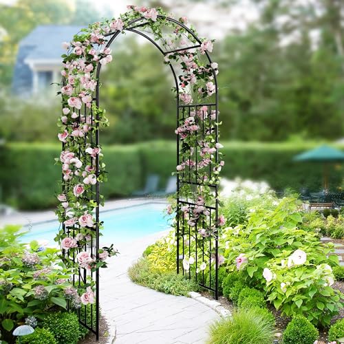 Durable & Stable: Sturdy steel tubing is treated with weather-resistant black epoxy to ensure stability and prolonged outdoor use; The reinforced supporting frame at the bottom features ground stakes so that the garden arch can withstand weather elements.