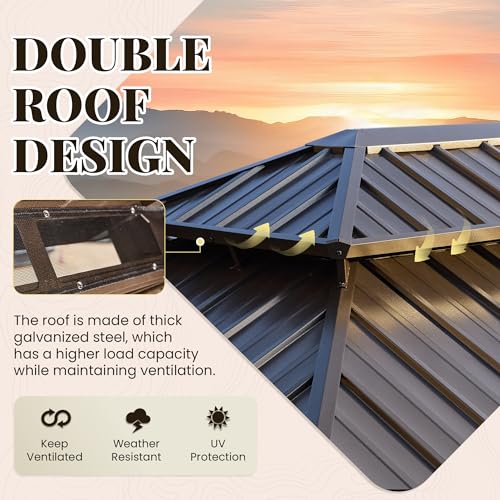 GALVANIZED STEEL DOUBLE ROOF: This patio gazebo has a double-layer galvanized steel roof that offers great ventilation and airflow. Its sturdy construction provides protection against wind, rain, and snow, while the galvanized steel material ensures thermal insulation, waterproofing, and noise reduction.