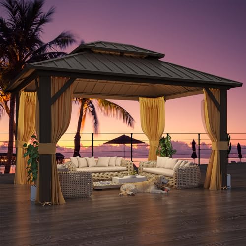 ALUMINUM FRAME: Sturdy permanent hardtop gazebo built with triangular powder-coated aluminum frames, which are more stable and durable than the standard. The 10x12 gazebo with pre-drilled bases is designed for various kinds of ground and can be installed in different outdoor situations.
