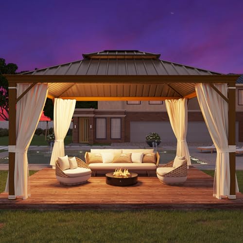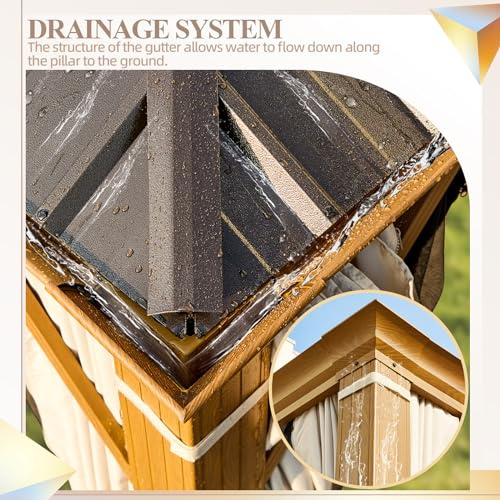 ?Aluminum Frame? The aluminum frame boasts an environmentally friendly powder coating that renders it resistant to scratches, peeling, and rusting. In addition, the outer layer of the outdoor gazebo columns is treated with a wood-grain finish for added aesthetics.