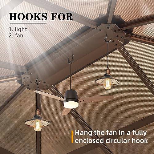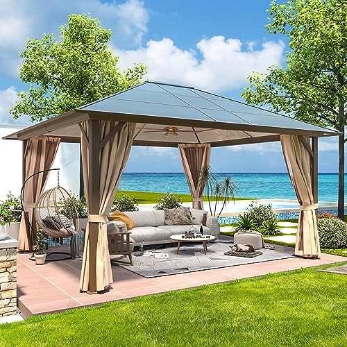 LASTING DURABILITY: This hardtop gazebo is equipped with a polycarbonate roof and strong triangular powder-coated aluminum frames. The incorporated ceiling hooks can be used for additional lights and fans. The sleek overhang roof design reduces rainwater gathering while preventing harmful UV rays. You can sunbathe under this pavilion without worrying about getting sunburned. *Please note that the polycarbonate roof can only block UV rays, not high temperatures and strong light