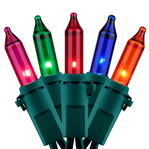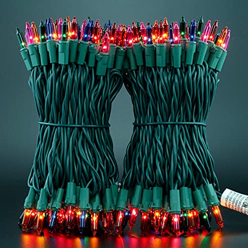 2 STRANDS IN 1 PACK ? 200 multicolor mini bulbs on green wire, 66 ft. total length.2 strands of 100 lights in one package. 33-foot per strand, 4-inch spacing, 6-inch lead, 4-inch tail. It can be used with an end-to-end connection or two separate strings as needed. Commercial grade 22 AWG wire with pure copper core, tough and heavy duty. Decorate in a rainbow of brilliant colors using multicolor string lights. Green wires are integrated with tree trunks and plants, only show colorful lights.