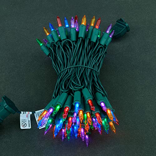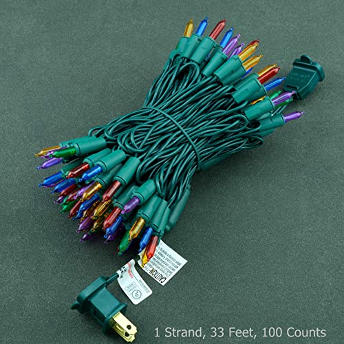 SPECIFICATIONS ? 33' total length of green wire with 100 multicolor (red, orange, green, blue, purple) LED bulbs, 4" spacing, 5" lead, 5" tail. Commercial grade 22 AWG wire with pure copper core. Strings can be connected end-to-end for expansion. 4.8 watts per strand, rated for 216 watts maximum wattage and up to 45 strands can be used simultaneously. Indoor and outdoor use. To order the realistic spruce Christmas tree with this lights pre-installed, please search ASIN B0CGF8YTBZ.