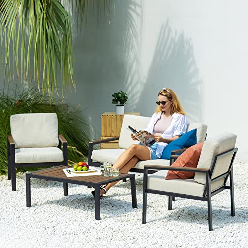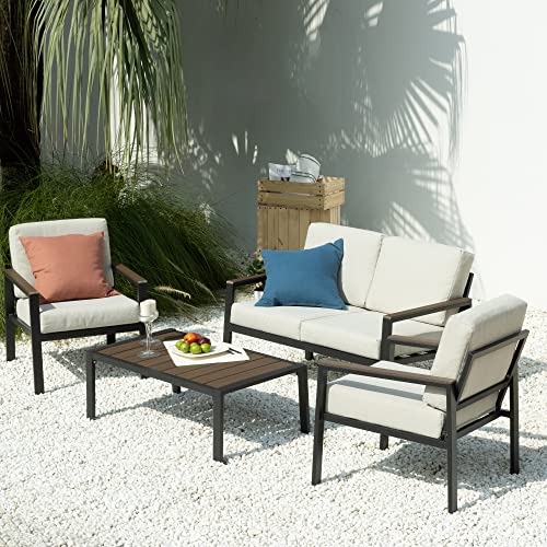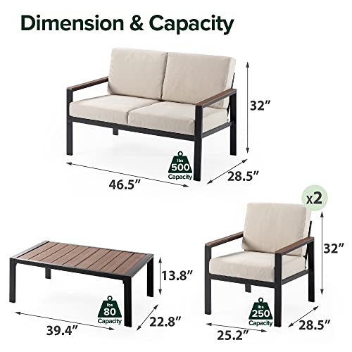 CONTEMPORARY COMFORT FOR YOUR OUTDOOR SPACE - Built with comfy cushioning, a sleek aluminum frame, and wood-like detailing, this contemporary and convenient 4-piece conversation set is optimally sized for four people